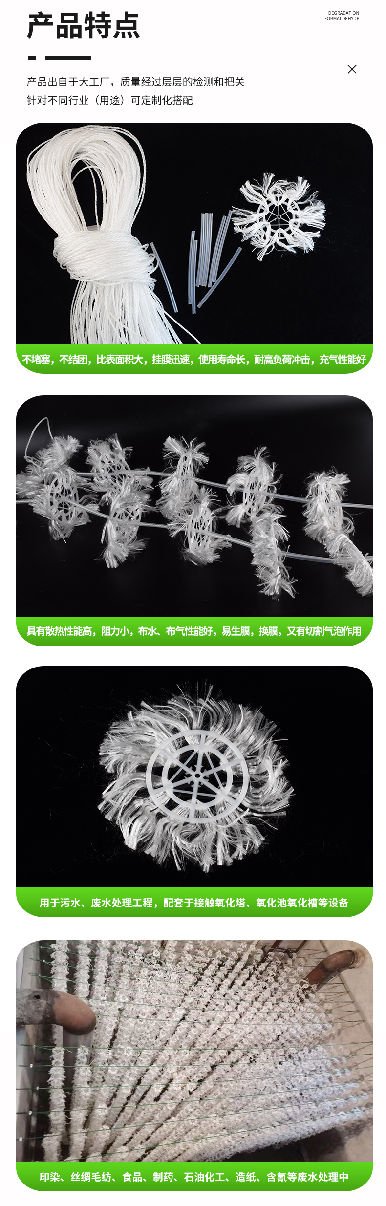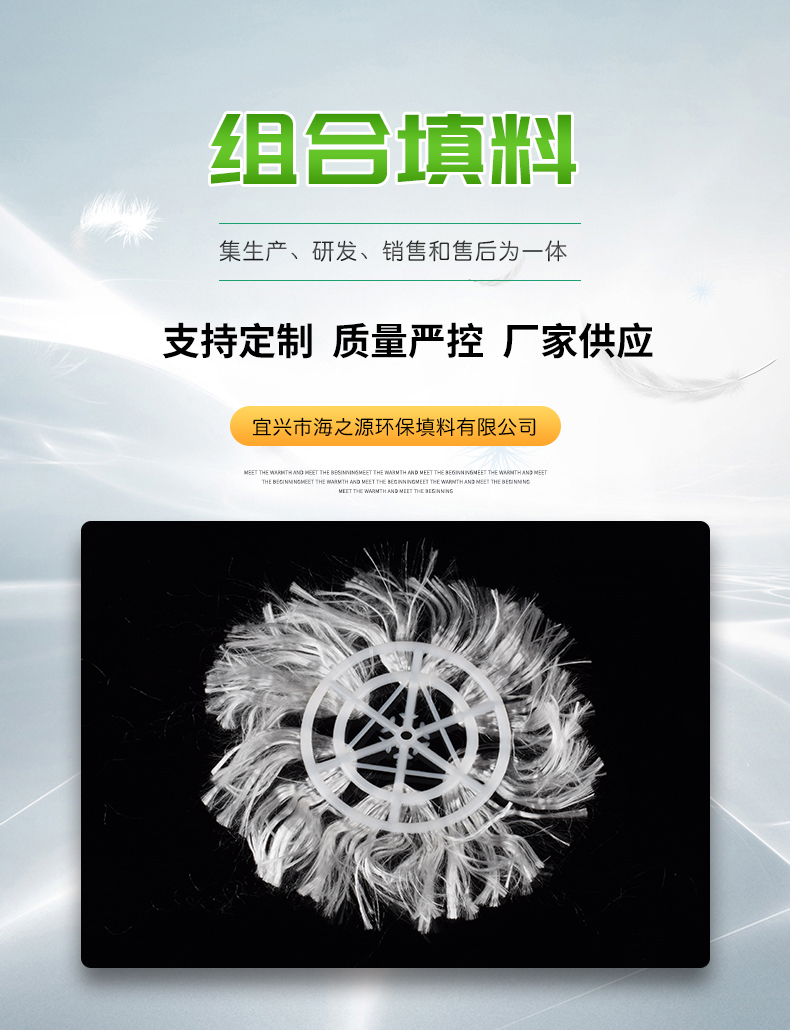 組合填料是在軟性填料和半軟性填料的基礎(chǔ)上發(fā)展而成的,它兼有兩者的優(yōu)點(diǎn)。其結(jié)構(gòu)是將塑料圓片壓扣改成雙圈大塑料環(huán),將醛化纖維或滌綸絲壓在環(huán)的環(huán)圈上,使纖維束均勻分布;內(nèi)圈是雪花狀塑料枝條,既能掛膜,又能有效切割氣泡,提高氧的轉(zhuǎn)移速率和利用率。使水氣生物膜得到充分交換,使水中的有機(jī)物得到高效處理。