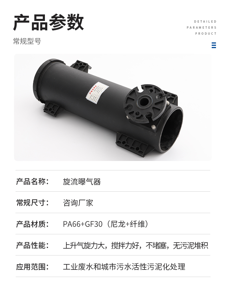 可升降旋流曝氣器整體由尼龍66+30%玻璃纖維制成,,具有較高的耐腐蝕性。其高度為42厘米,內徑為12厘米,進氣口中心距曝氣頭底部5厘米。