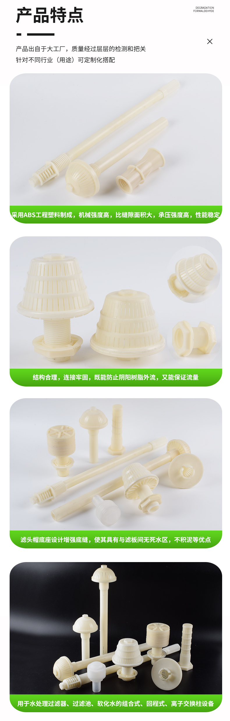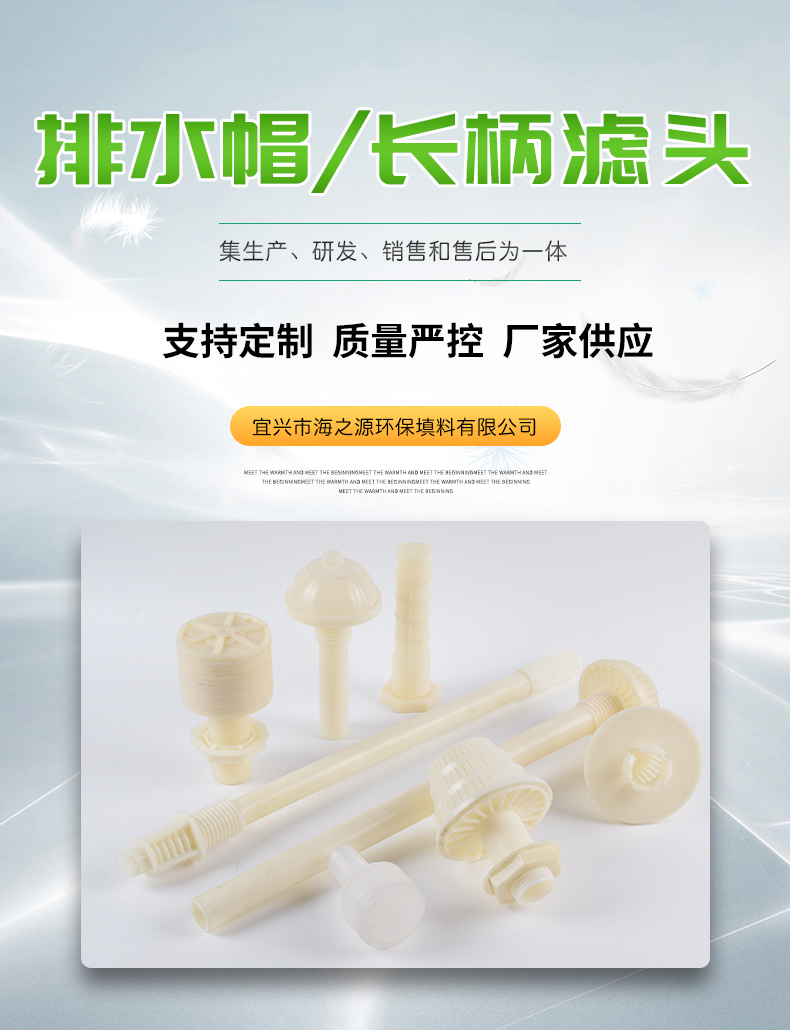 濾頭又叫濾帽,用在濾池配水系統和過濾器中。反沖洗濾頭包括排水帽、濾水帽兩種,均采用ABS工程塑料制成,結構合理,連接牢固,承壓強度高,縫隙不變型,使用效果好,既能防止陰陽樹脂外流,又能保證流量。適用于濾池汽水反沖洗系統和軟化水質組合式,壓力式,回程式及離子交換器等水處理設備的過濾裝置。